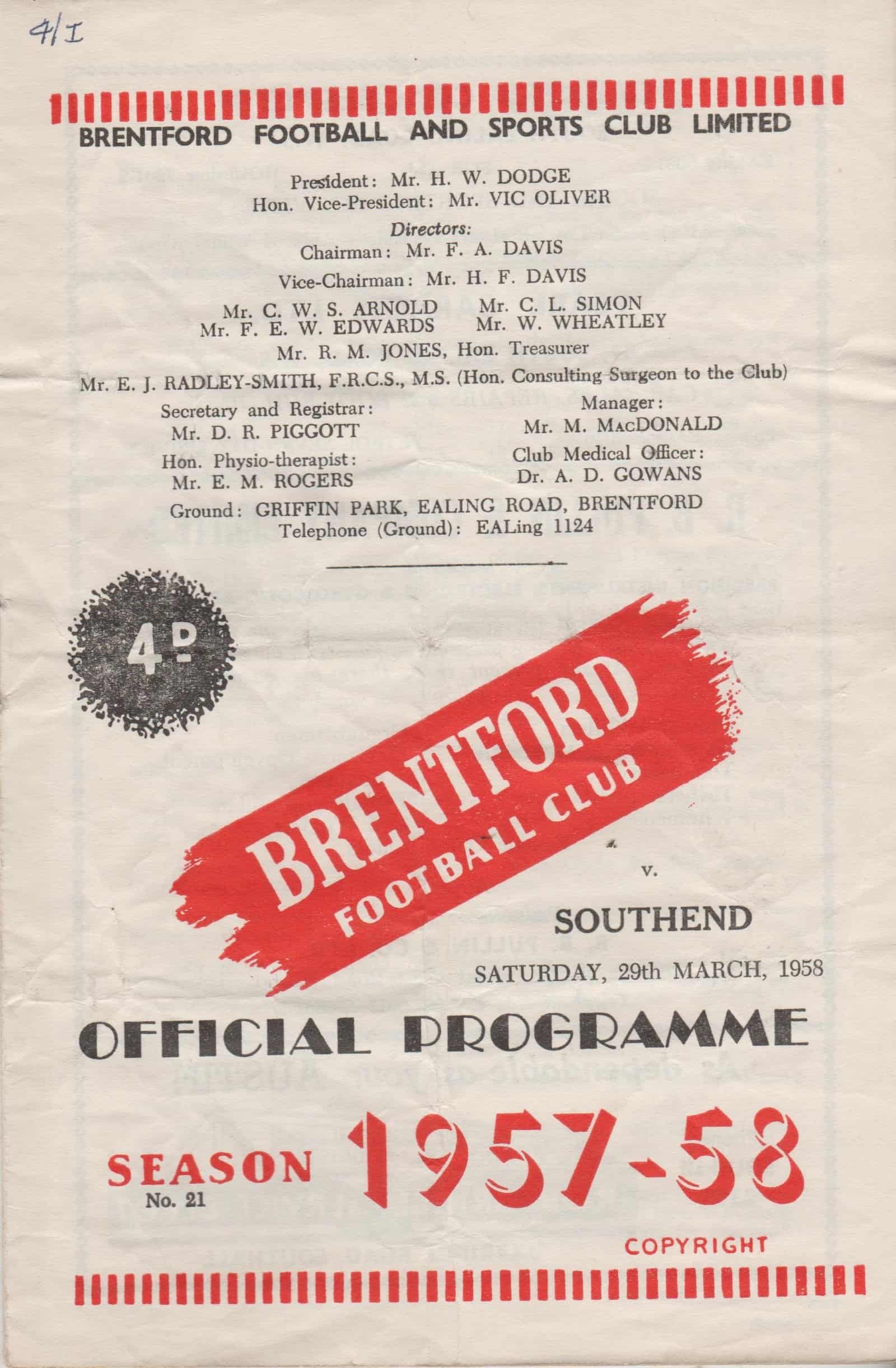 Match: Brentford v Southend United Competition: League Division 3 South Date: 29-Mar-1958 Comments: Rating: 3 Condition: Creases, number on face, half time scores and team changes in pencil Weight in grams: 40