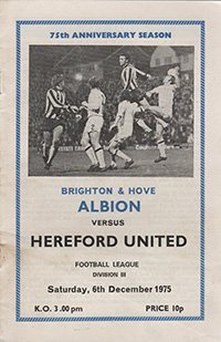 Match: Brighton and Hove Albion v Hereford United Competition: League Division 3 Date: 06-12-1975 Comments: Postponed issue Rating: 4 Condition: Very good Weight in grams: 60