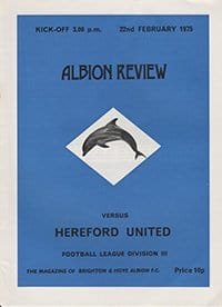 Match: Brighton and Hove Albion v Hereford United Competition: League Division 3 Date: 22-02-1975 Comments: Rating: 3 Condition: Team changes, rusty staples, staple bleed on back page Weight in grams: 80
