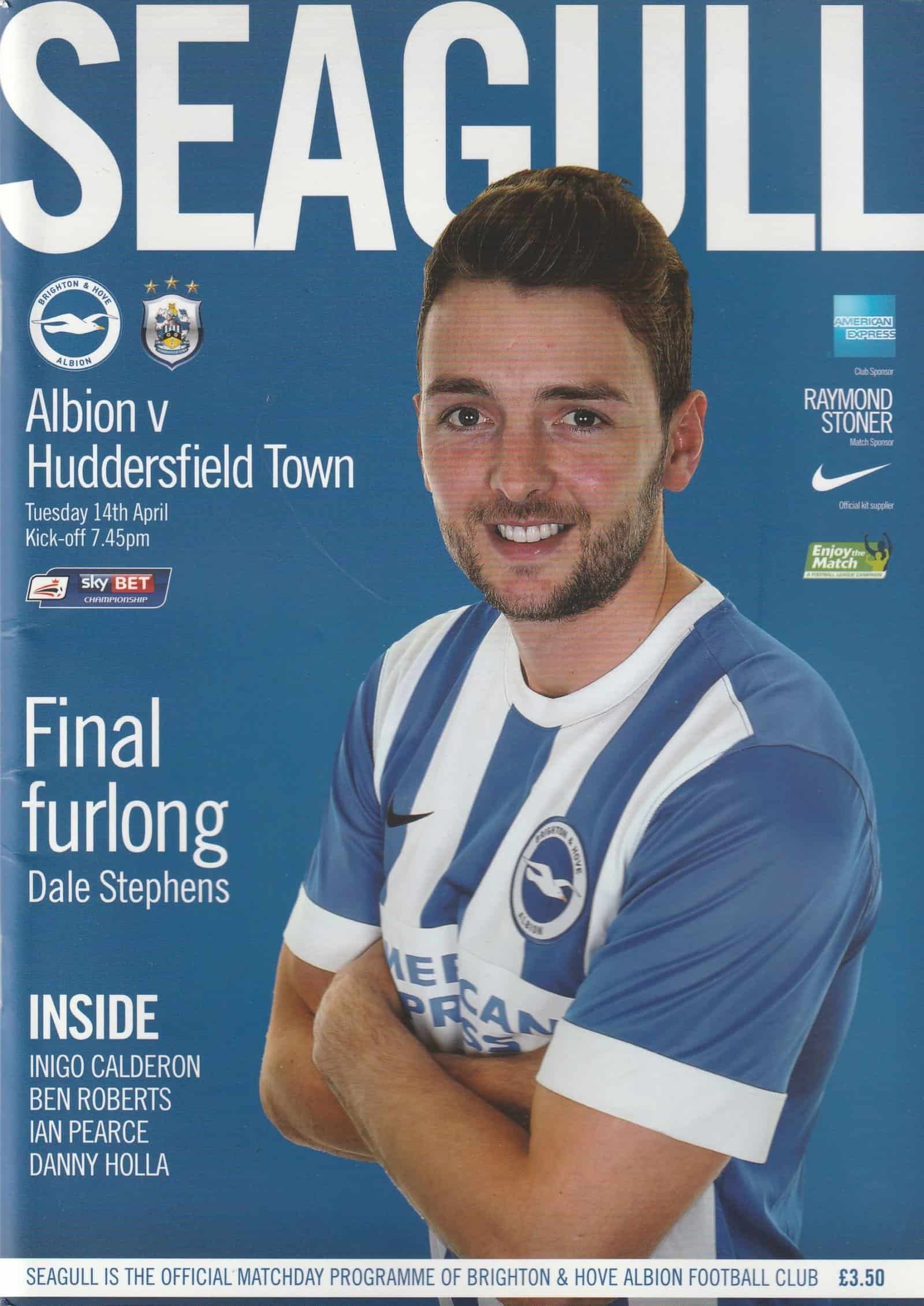 Match: Brighton and Hove Albion v Huddersfield Town Competition: Sky Bet Championship Date: 14-Apr-2015 Comments: Rating: 4 Condition: Very good Weight in grams: 260