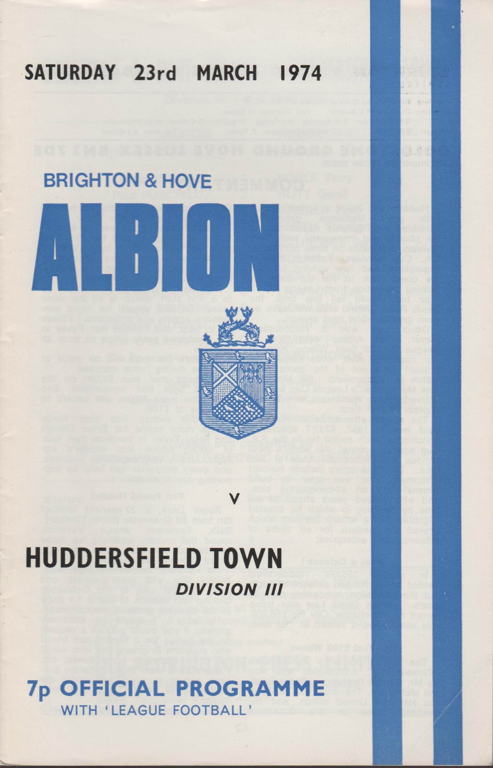 Match: Brighton and Hove Albion v Huddersfield Town Competition: League Division 3 Date: 23-03-1974 Comments: Rating: 4 Condition: Very good Weight in grams: 60