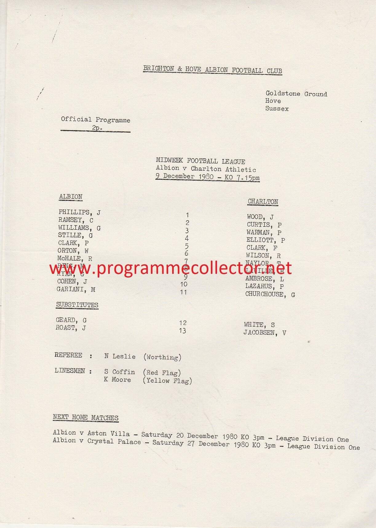 Match: Brighton & Hove Albion Reserves v Charlton Athletic Reserves Competition: Midweek League Date: 09-Dec-1980 Comments: Single sheet issue Rating: 4 Condition: Slight fold Weight in grams: 20