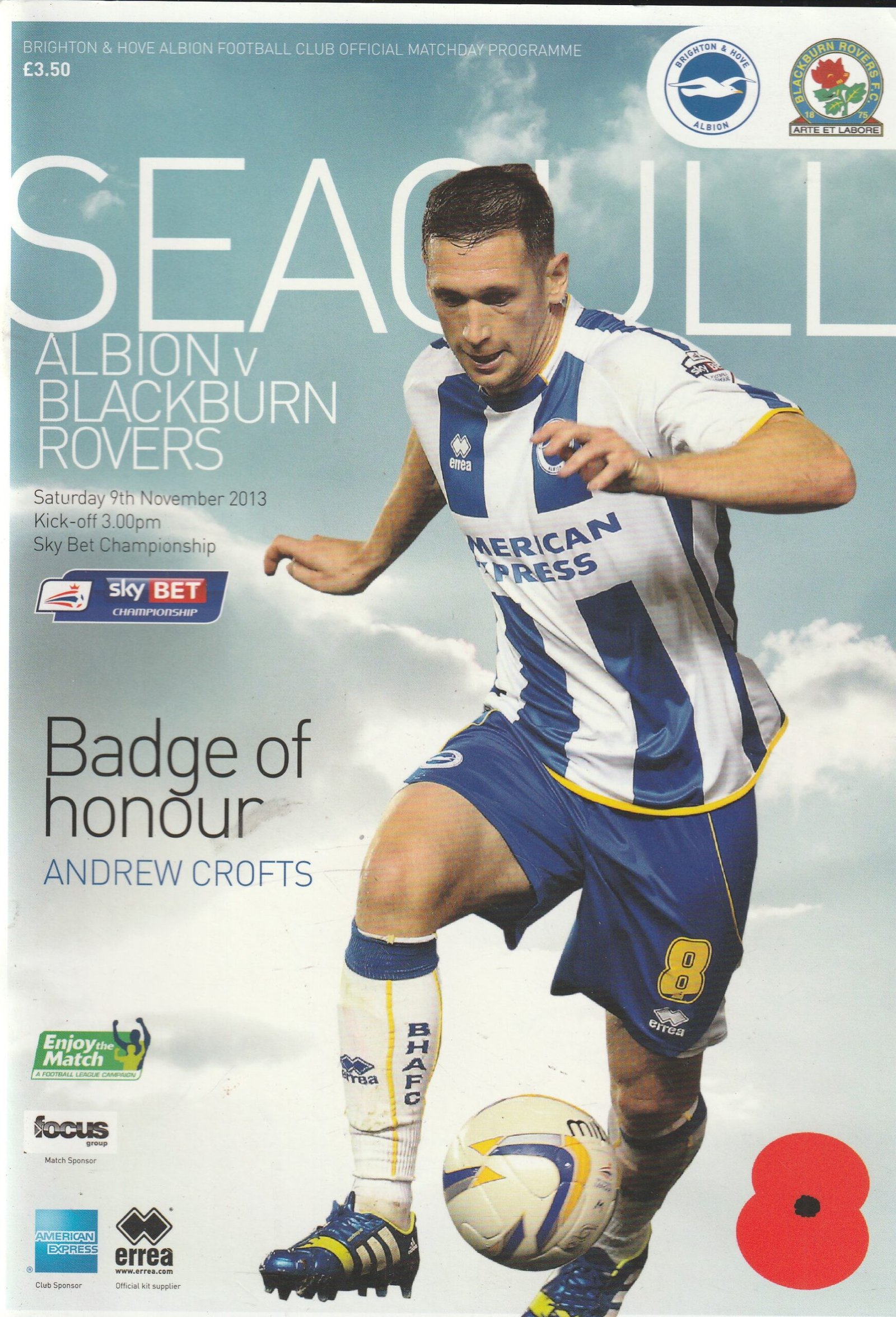 Match: Brighton & Hove Albion v Blackburn Rovers Competition: SkyBet Championship Date: 09-Nov-2013 Comments: Rating: 4 Condition: Very good Weight in grams: 260