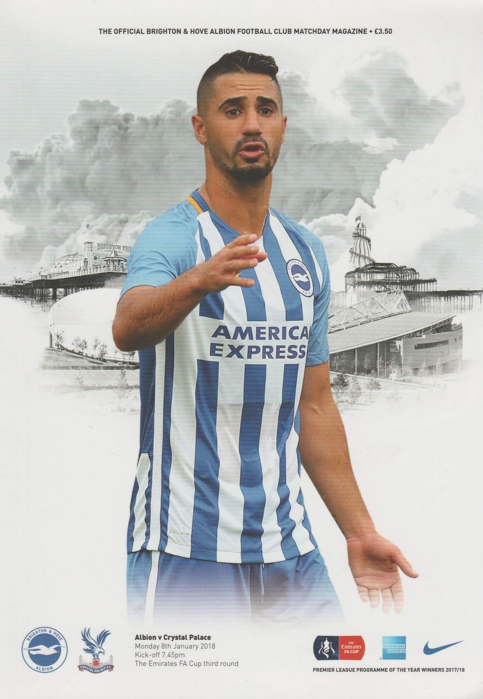 Match: Brighton & Hove Albion v Crystal Palace Competition: FA Cup 3rd Round Date: 08-Jan-2018 Comments: Rating: 4 Condition: Very good Weight in grams: 200