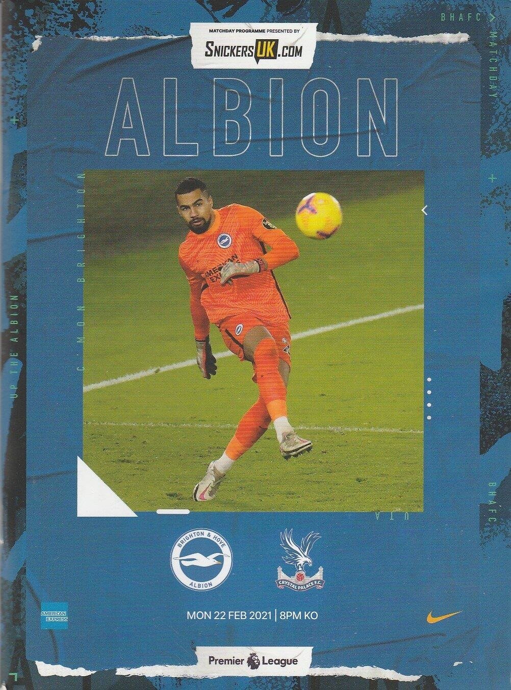 Match: Brighton & Hove Albion v Crystal Palace Competition: Premier League Date: 22-Feb-2021 Comments: Rating: 4 Condition: Very good Weight in grams: 320