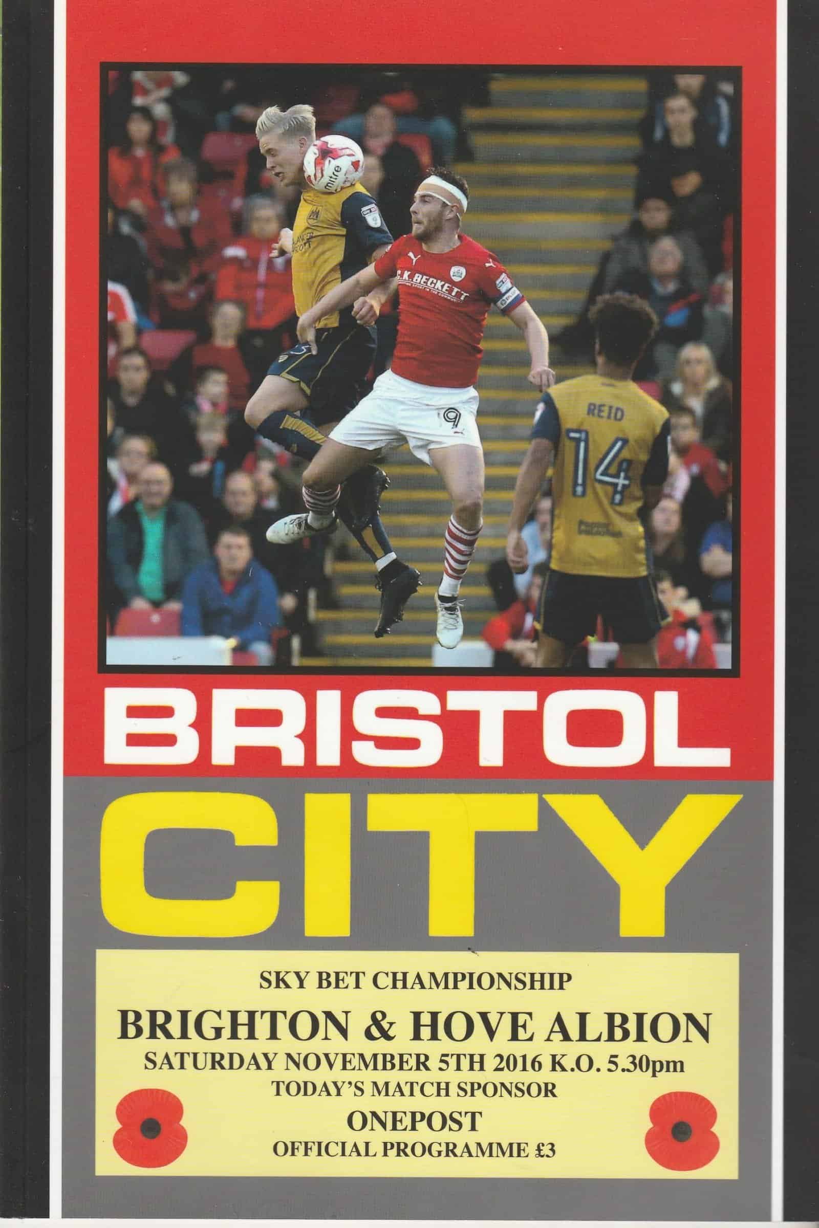 Match: Bristol City v Brighton & Hove Albion Competition: League Championship Date: 05-Nov-2016 Comments: Rating: 4 Condition: Very good Weight in grams: 200