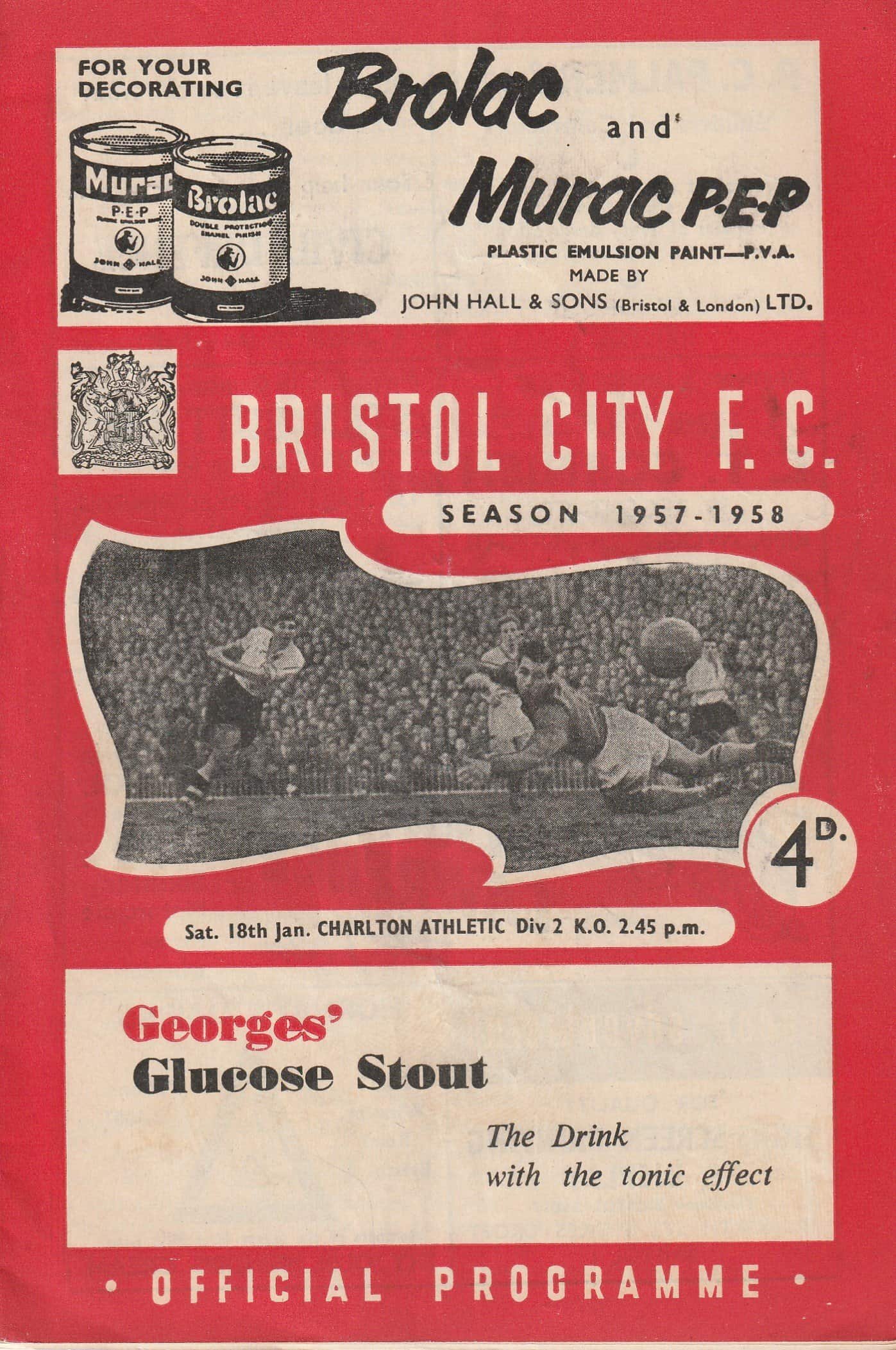 Match: Bristol City v Charlton Athletic Competition: League Division 2 Date: 18-Jan-1958 Comments: Staples removed, slight fold, team changes Rating: 3 Condition: Weight in grams: 40
