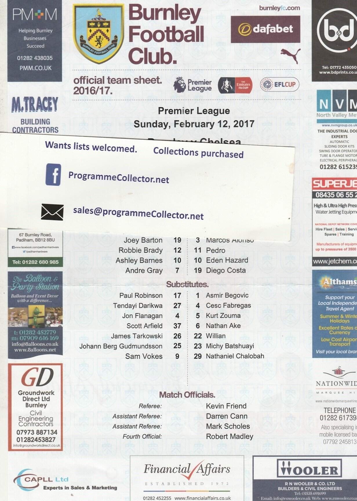 Match: Burnley v Chelsea Competition: Premier League Date: 12-Feb-2017 Comments: Rating: 3 Condition: Folds Weight in grams: 10