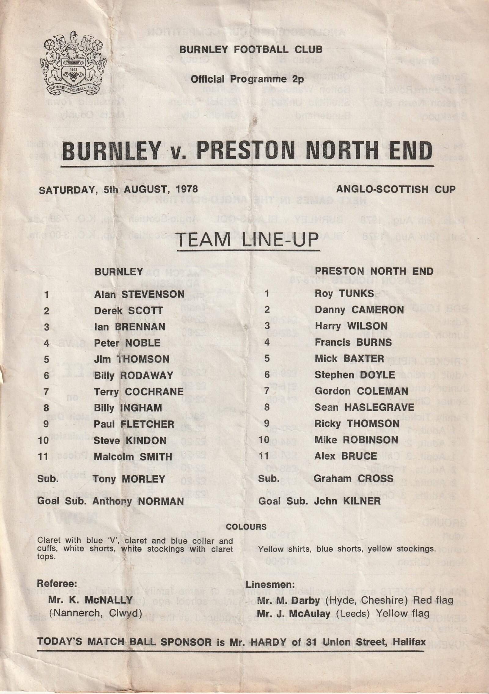 Match: Burnley v Preston North End Competition: Anglo Scottish Cup Date: 05-Aug-1978 Comments: Single sheet Rating: 3 Condition: Excellent Weight in grams: 40