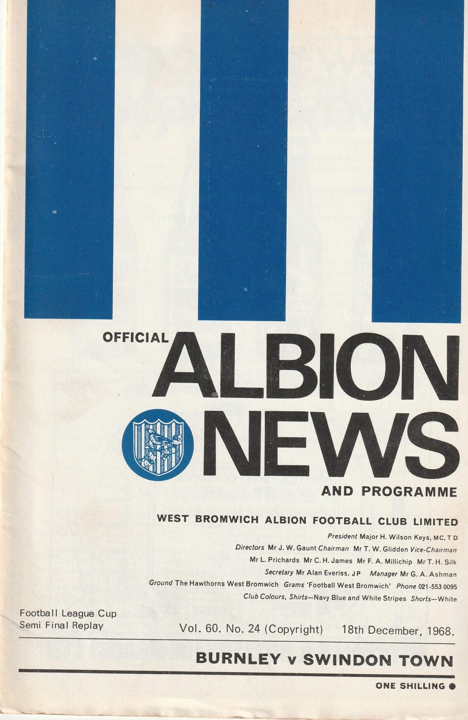 Match: Burnley v Swindon Town Competition: League Cup Semi Final Replay Date: 18-Dec-1968 Comments: Rating: 4 Condition: Good Weight in grams: 60