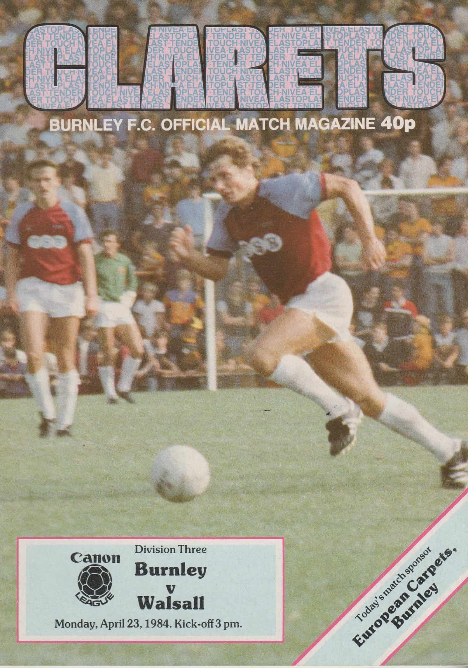 Match: Burnley v Walsall Competition: League Division 3 Date: 23-Apr-1984 Comments: Rating: 4 Condition: Very good Weight in grams: 80