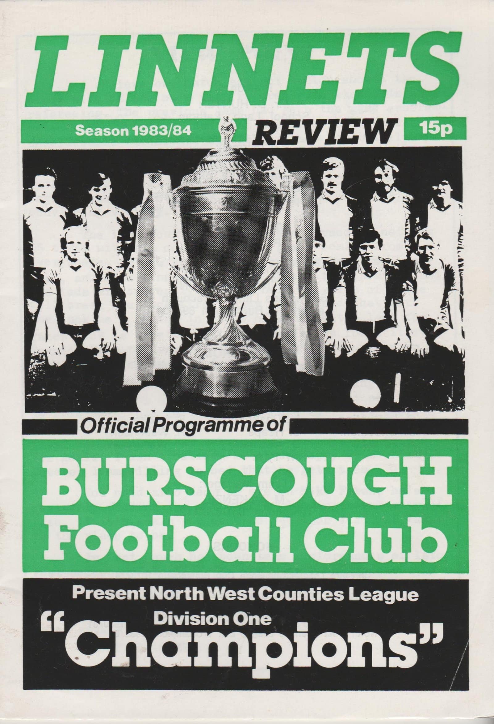 Match: Burscough v Accrington Stanley Competition: North West Counties League Division 1 Date: 27-Mar-1984 Comments: Rating: 3 Condition: Fold on edge of cover Weight in grams: 60