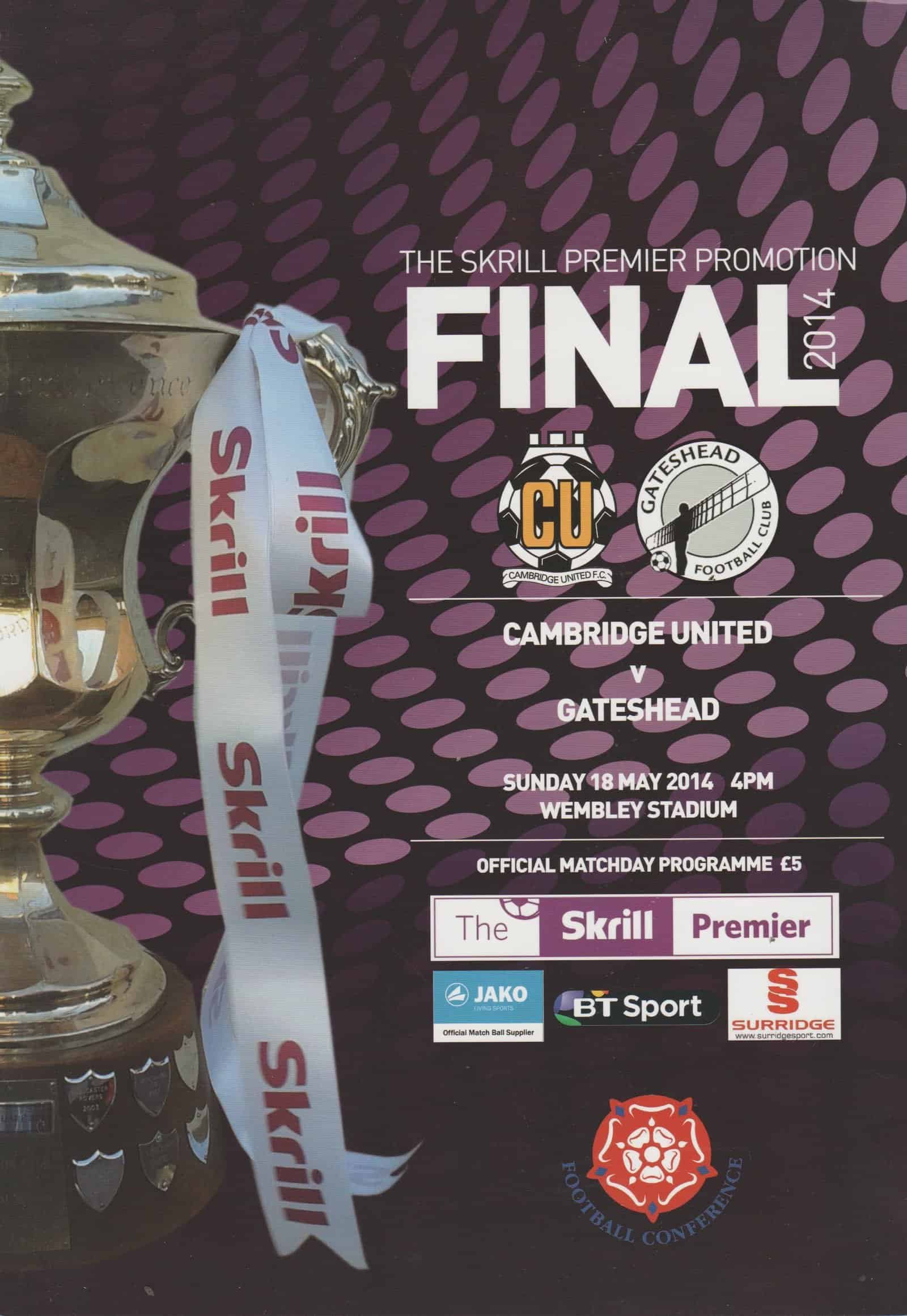 Match: Cambridge United v Gateshead Competition: Skrill Premier Play off Final Date: 18-May-2014 Comments: Rating: 4 Condition: Very good Weight in grams: 300