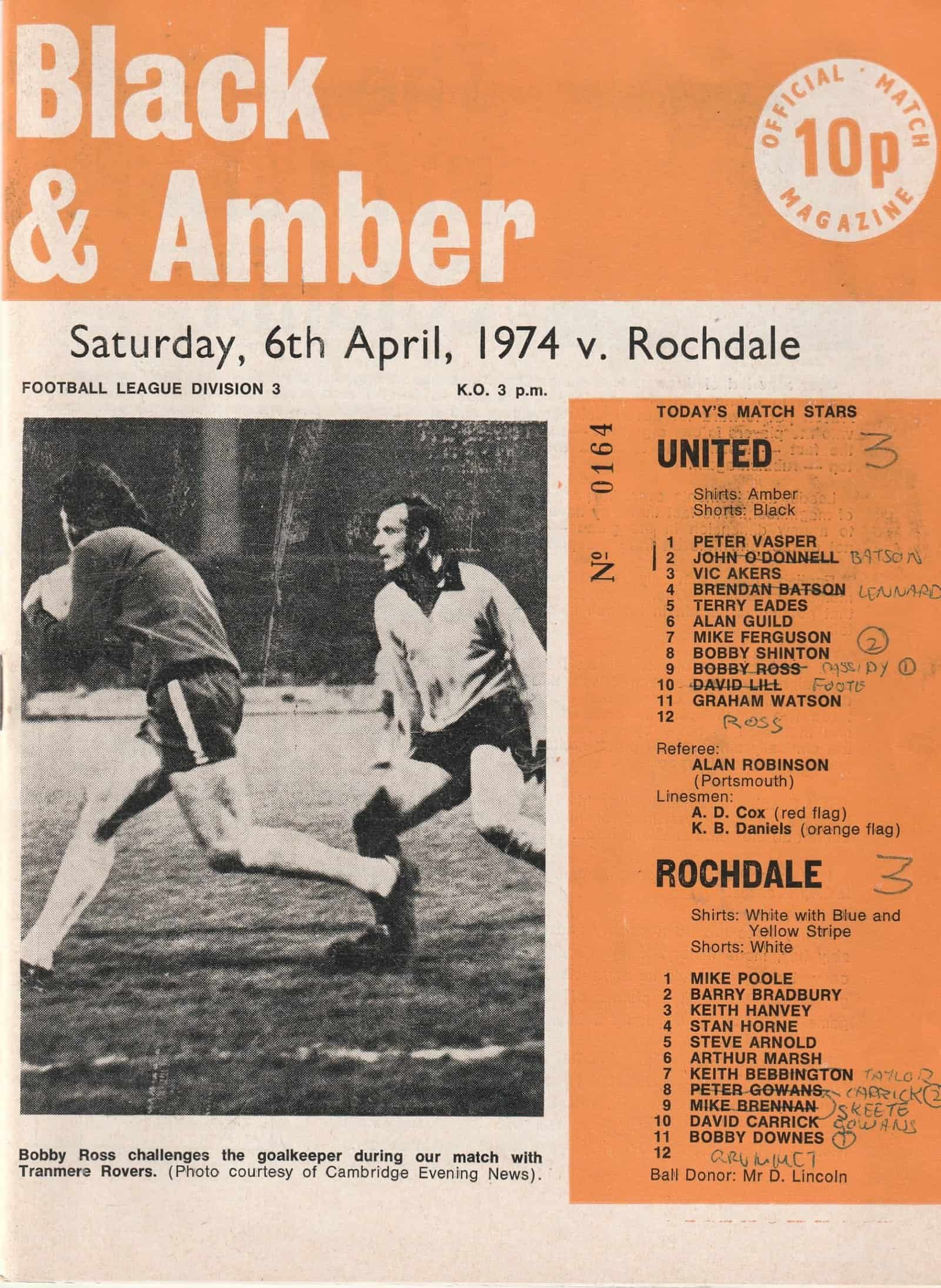 Match: Cambridge United v Rochdale Competition: League Division 3 Date: 06-Apr-1974 Comments: Rating: 3 Condition: Team changes, rusty staple Weight in grams: 140