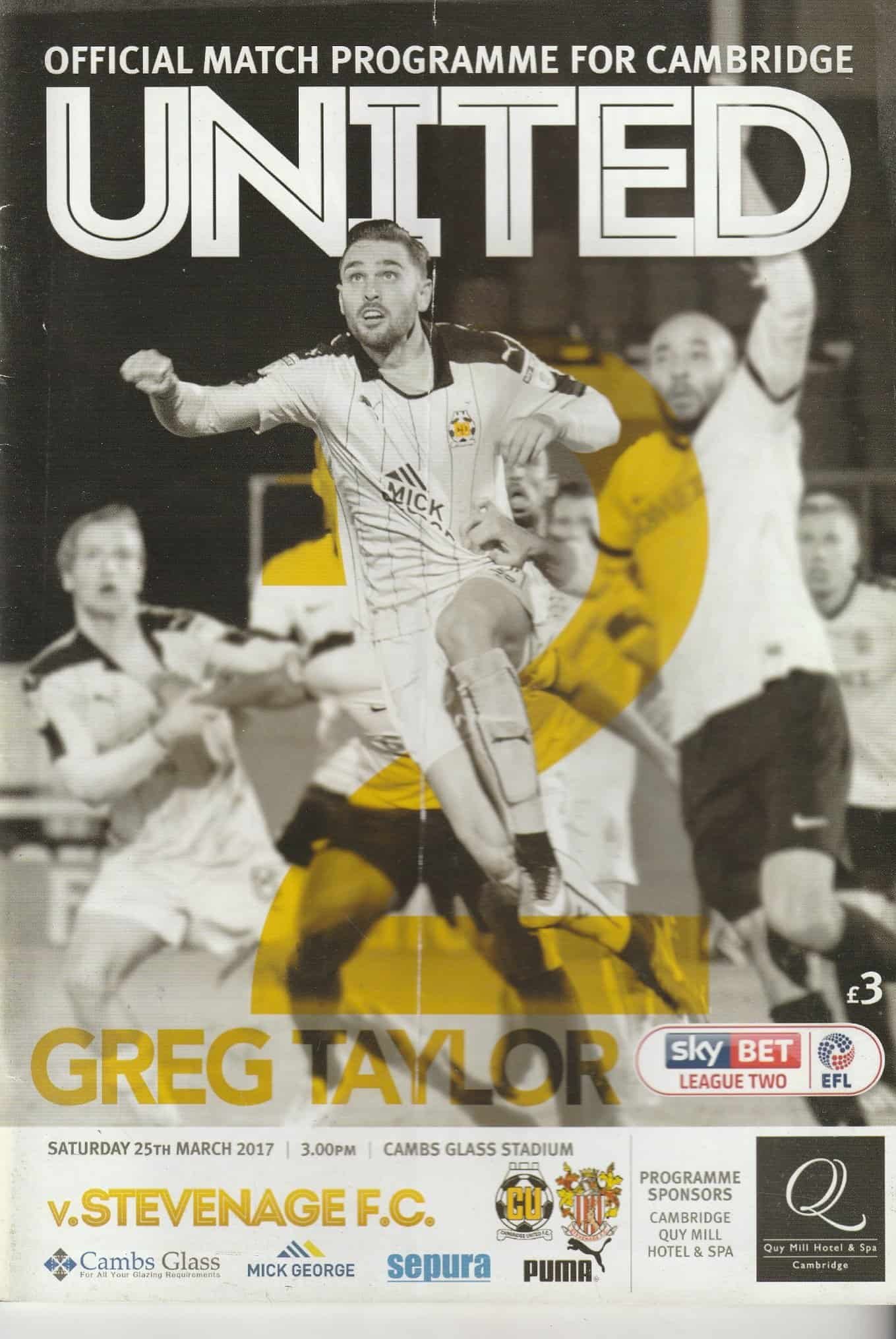 Match: Cambridge United v Stevenage Competition: League 2 Date: 25-Mar-2017 Comments: Rating: 3 Condition: Fold, indentation on back page Weight in grams: 200