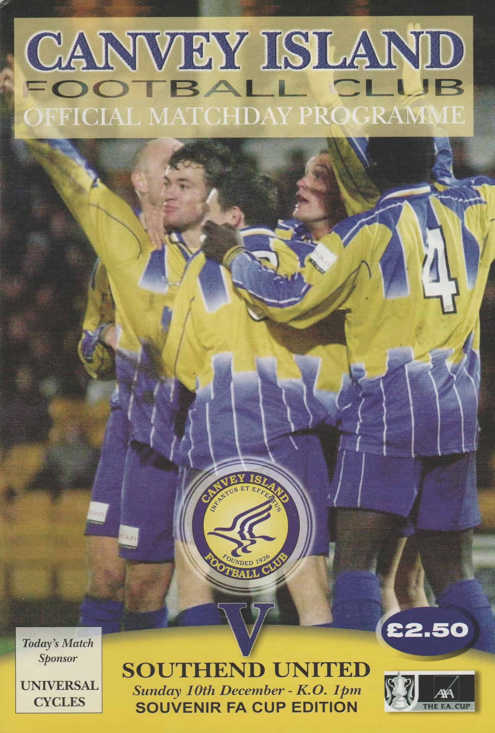 Match: Canvey Island v Southend United Competition: FA Cup 2nd Round Date: 10-Dec-2000 Comments: Rating: 5 Condition: Excellent Weight in grams: 140