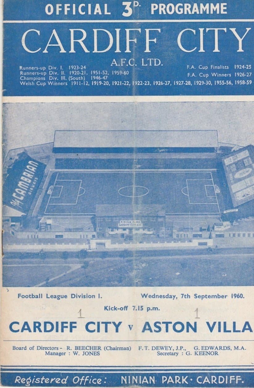 Match: Cardiff City v Aston Villa Competition: League Division 1 Date: 07-Sep-1960 Comments: Rating: 3 Condition: Team changes, score on face, fold Weight in grams: 60