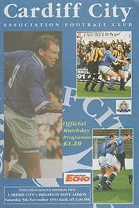 Match: Cardiff City v Brighton and Hove Albion Competition: League Division 2 Date: 05-11-1994 Comments: Rating: 2 Condition: Team changes, Centre fold poster missing Weight in grams: 80