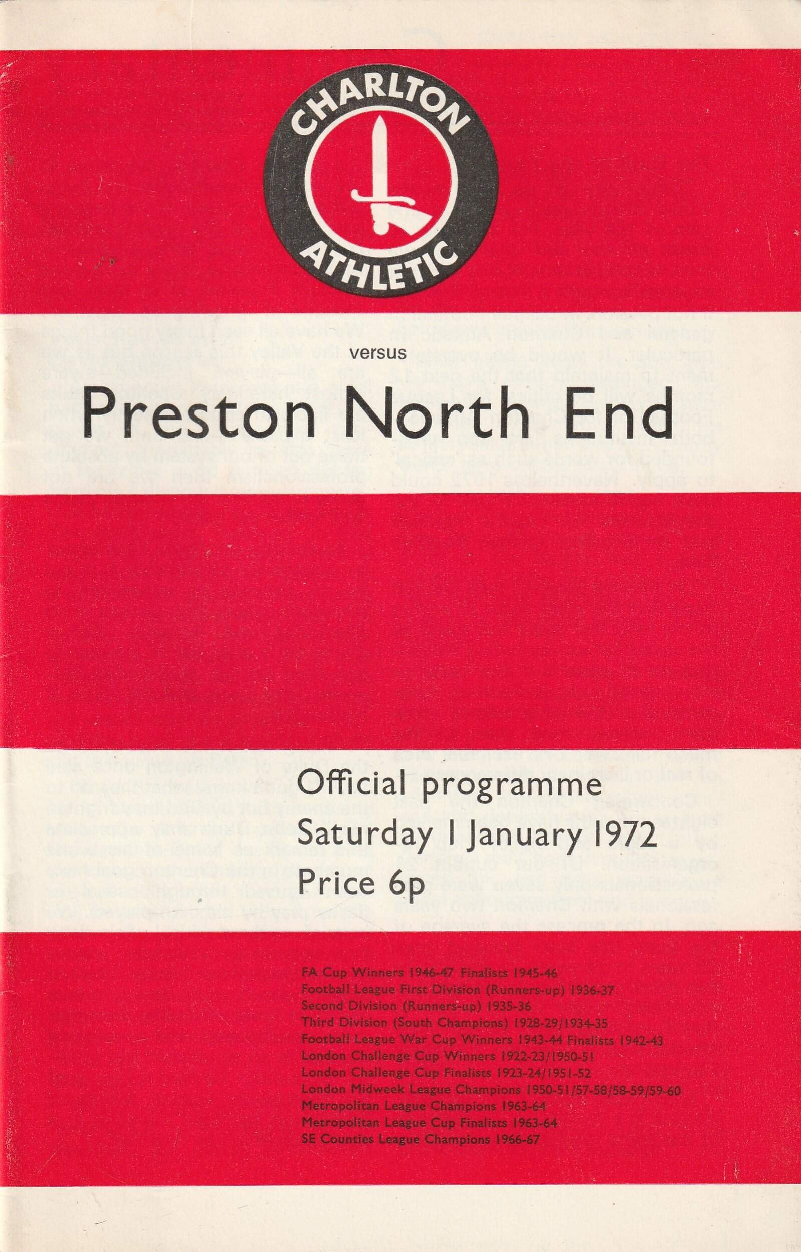 Match: Charlton Athletic v Preston North End Competition: League Division 2 Date: 01-Jan-1972 Comments: Rating: 4 Condition: Small spot mark on back page Weight in grams: 80