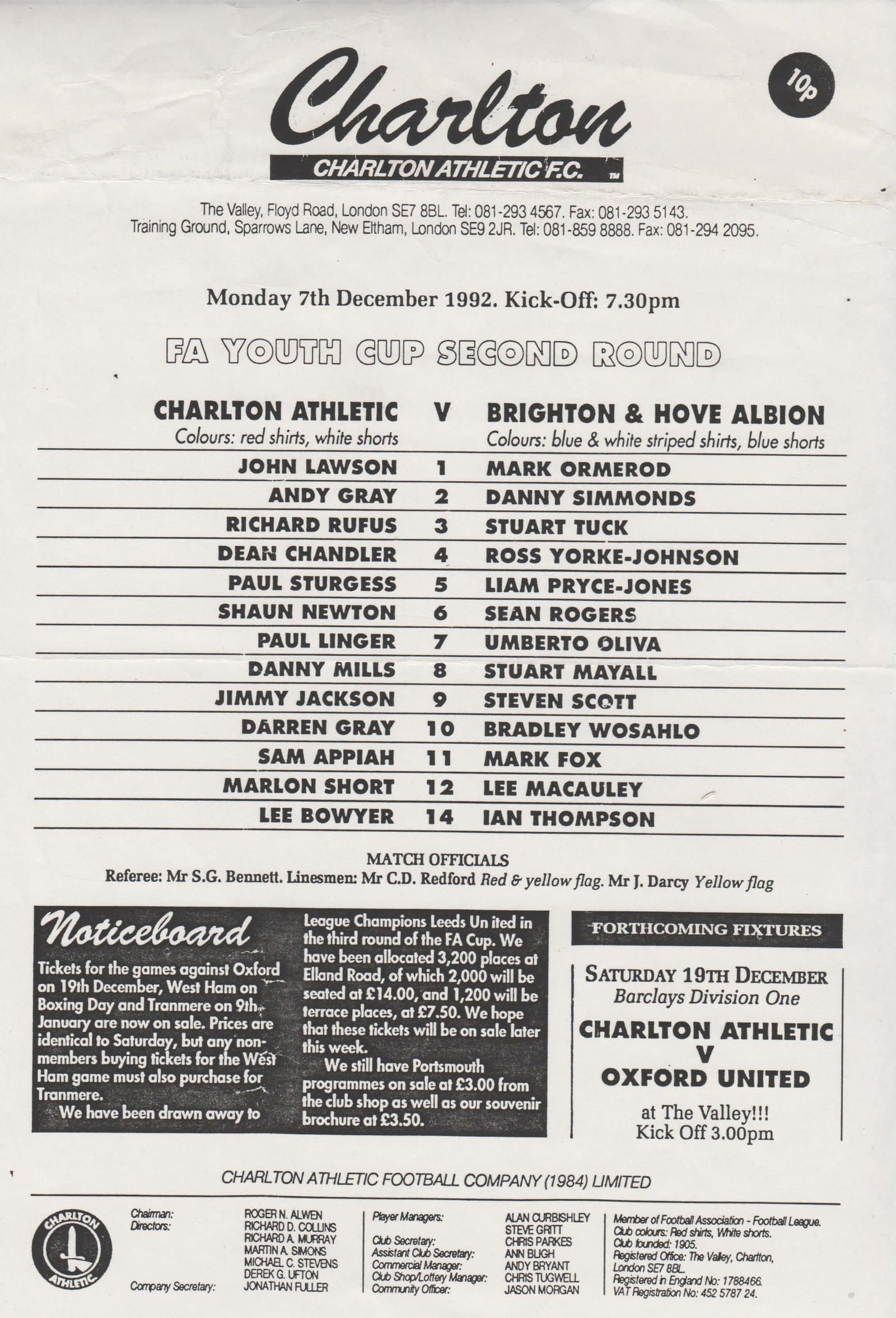 Match: Charlton Athletic Youth v Brighton & Hove Albion Youth Competition: FA Youth Cup 2nd Round Date: 07-Dec-1992 Comments: Single sheet Rating: 4 Condition: Fold Weight in grams:10