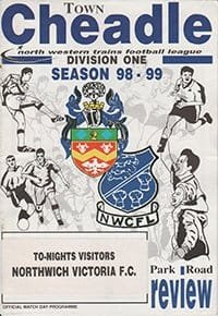 Match: Cheadle Town v Northwich Victoria Competition: Cheshire County FA Unibond Senior Cup 1st Round Date: 22-09-1998 Comments: Rating: 3 Condition: Rusty staples, staple bleed, team changes Weight in grams: 60