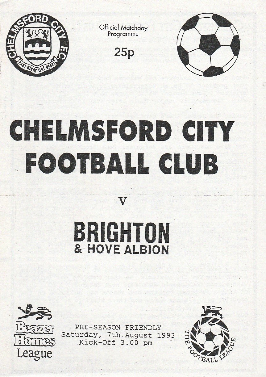 Match: Chelmsford City v Brighton & Hove Albion Competition: Friendly Date: 07-Aug-1993 Comments: 4 page issue Rating: 4 Condition: Very good Weight in grams: 40
