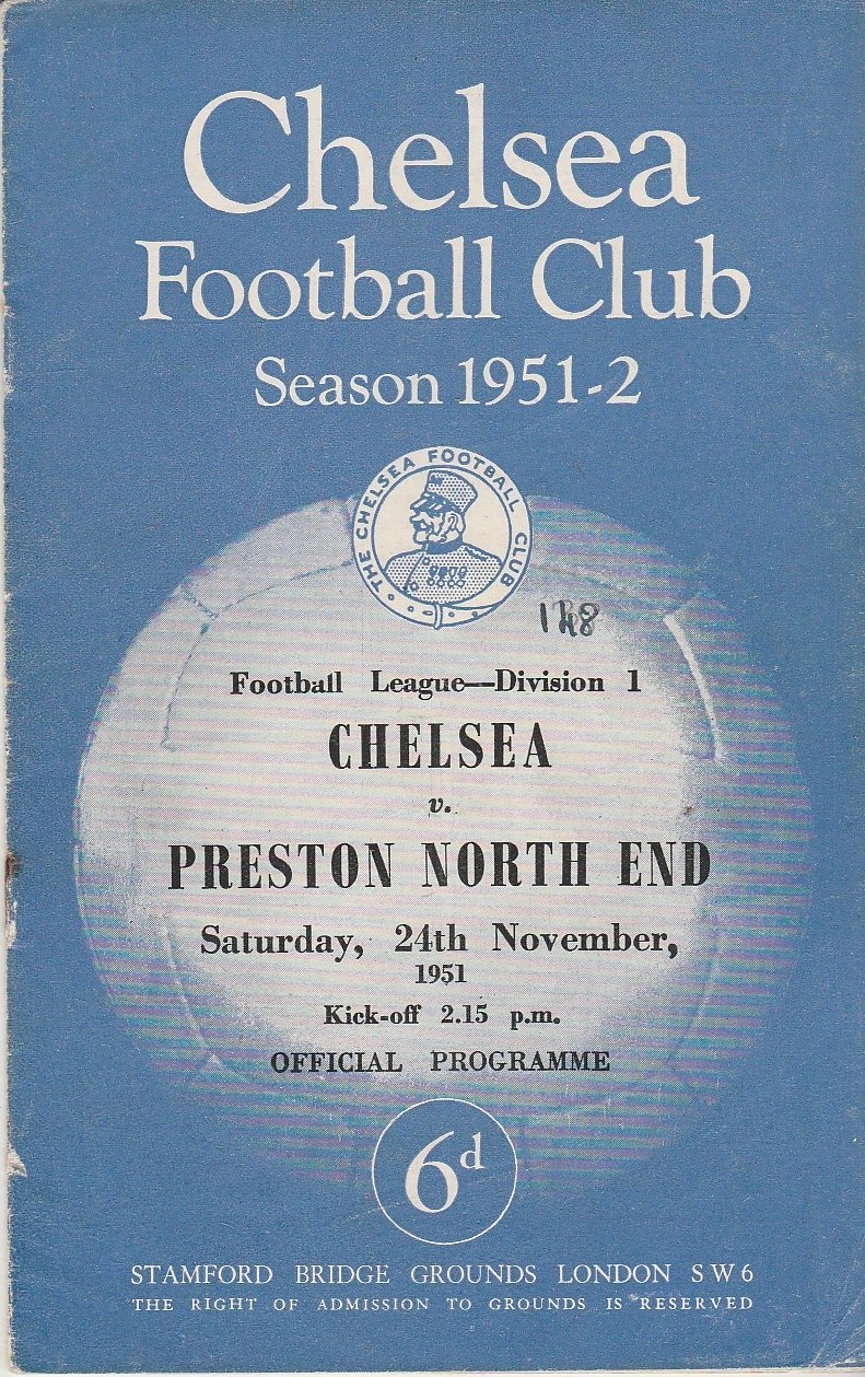 Match: Chelsea v Preston North End Competition: League Division 1 Date: 24-Nov-1951 Comments: Rating: 3 Condition: Number on face, corner crease on cover, fold, team changes Weight in grams: 60