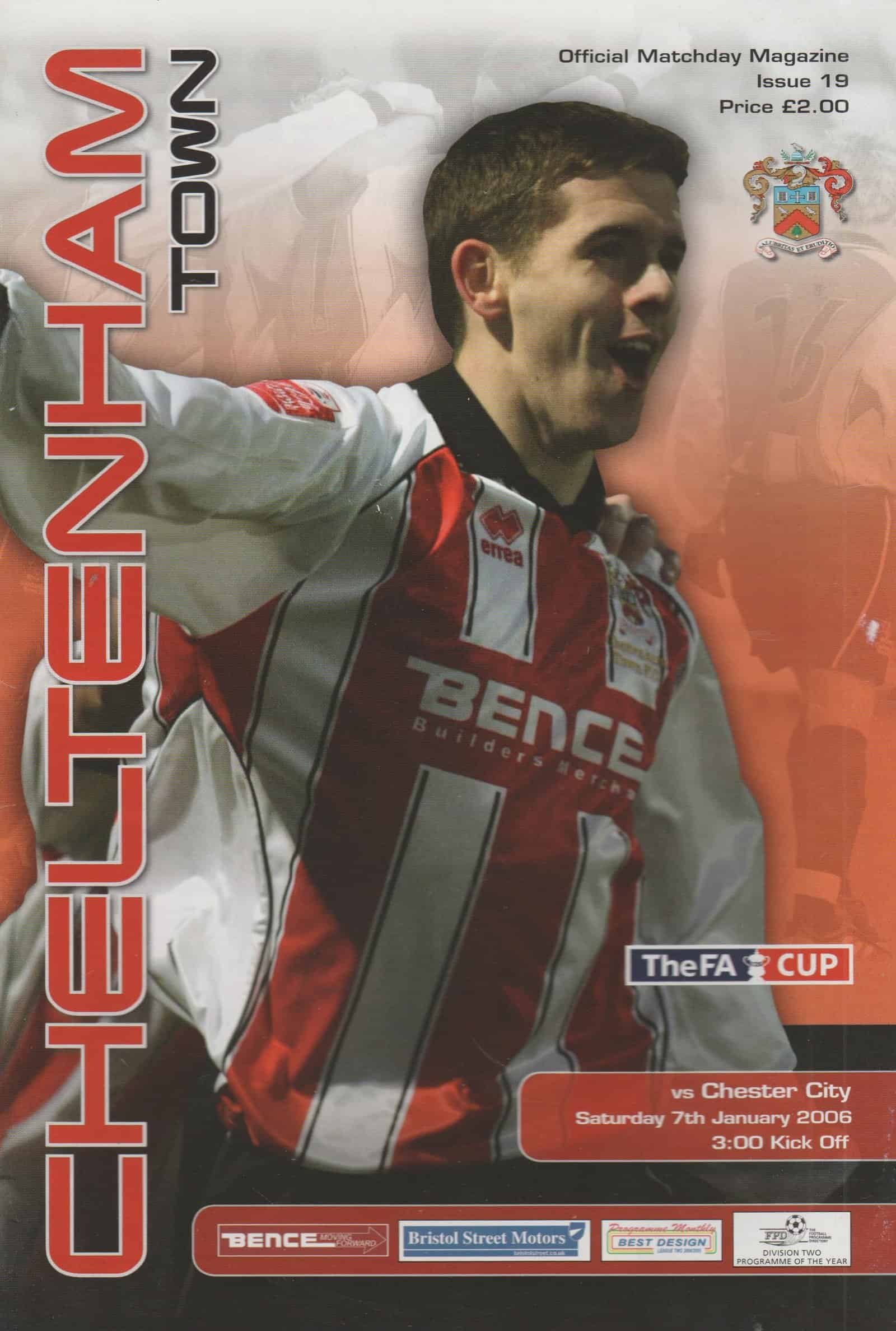 Match: Cheltenham Town v Chester City Competition: FA Cup 3rd Round Date: 07-Jan-2006 Comments: Rating: 4 Condition: Small nick on back page Weight in grams: 140