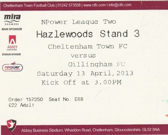 Match: Cheltenham Town v Gillingham Competition: N Power League 2 Date: 13-Apr-2013 Comments: Rating: 4 Condition: Very good Weight in grams: 20
