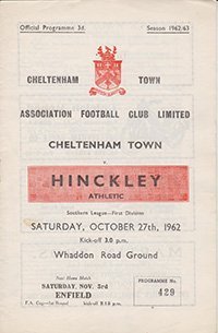 Match: Cheltenham Town v Hinckley Athletic Competition: Southern League First Division Date: 27-10-1962 Comments: Rating: 4 Condition: Slight mark on cover, faint fold Weight in grams: 60