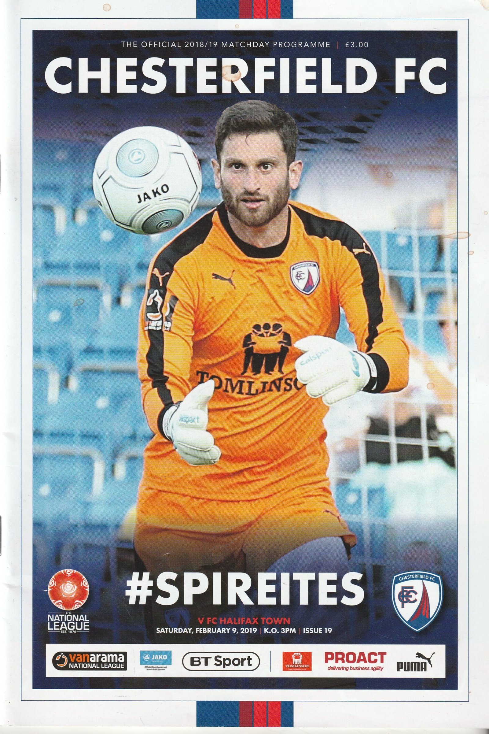 Match: Chesterfield v FC Halifax Town Competition: Vanarama National League Date: 09-Feb-2019 Comments: Rating: 4 Condition: Slight marks on cover Weight in grams: 160
