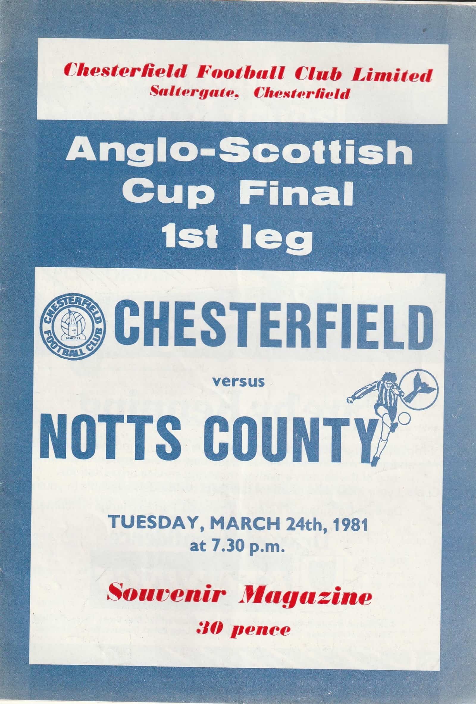 Match: Chesterfield v Notts County Competition: Anglo Scottish Cup Final 1st leg Date: 24-Mar-1981 Comments: Rating: 4 Condition: Good Weight in grams: 140