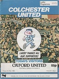 Match: Colchester United v Oxford United Competition: League Division 3 Date: 02-05-1980 Comments: Rating: 3 Condition: Score on back, corner turn, mark in top corner Weight in grams: 80