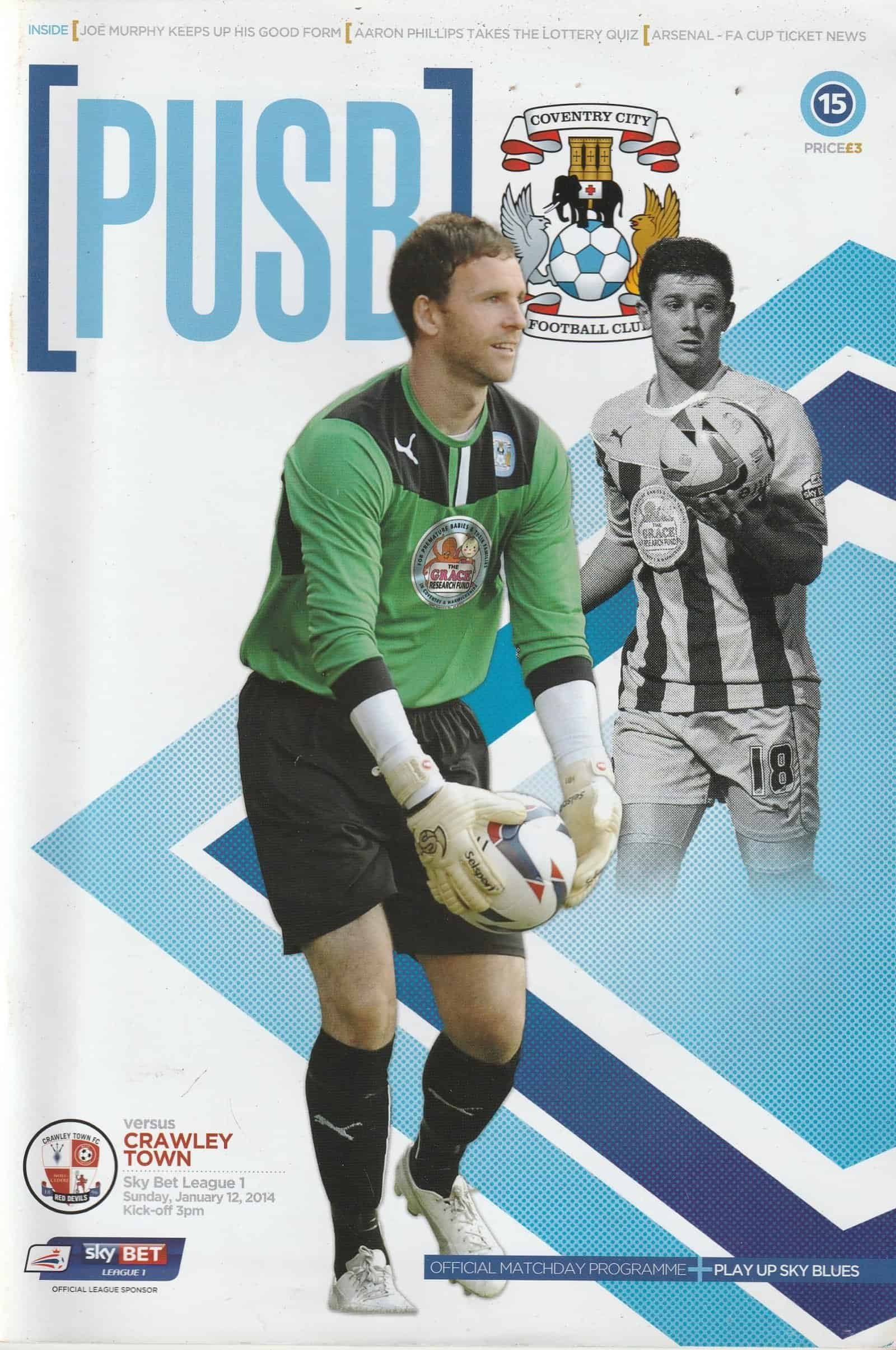 Match: Coventry City v Crawley Town Competition: League 1 Date: 12-Jan-2014 Comments: Rating: 3 Condition: Tear on back page Weight in grams: 200