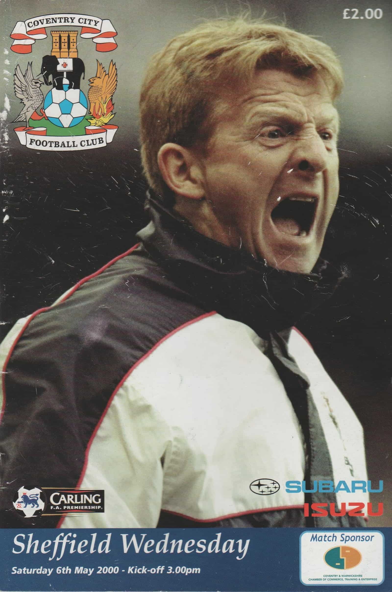 Match: Coventry City v Sheffield Wednesday Competition: Premier League Date: 06-May-2000 Comments: Rating: 3 Condition: Scuff marks on cover, print smudge on back, crease on back Weight in grams: 140