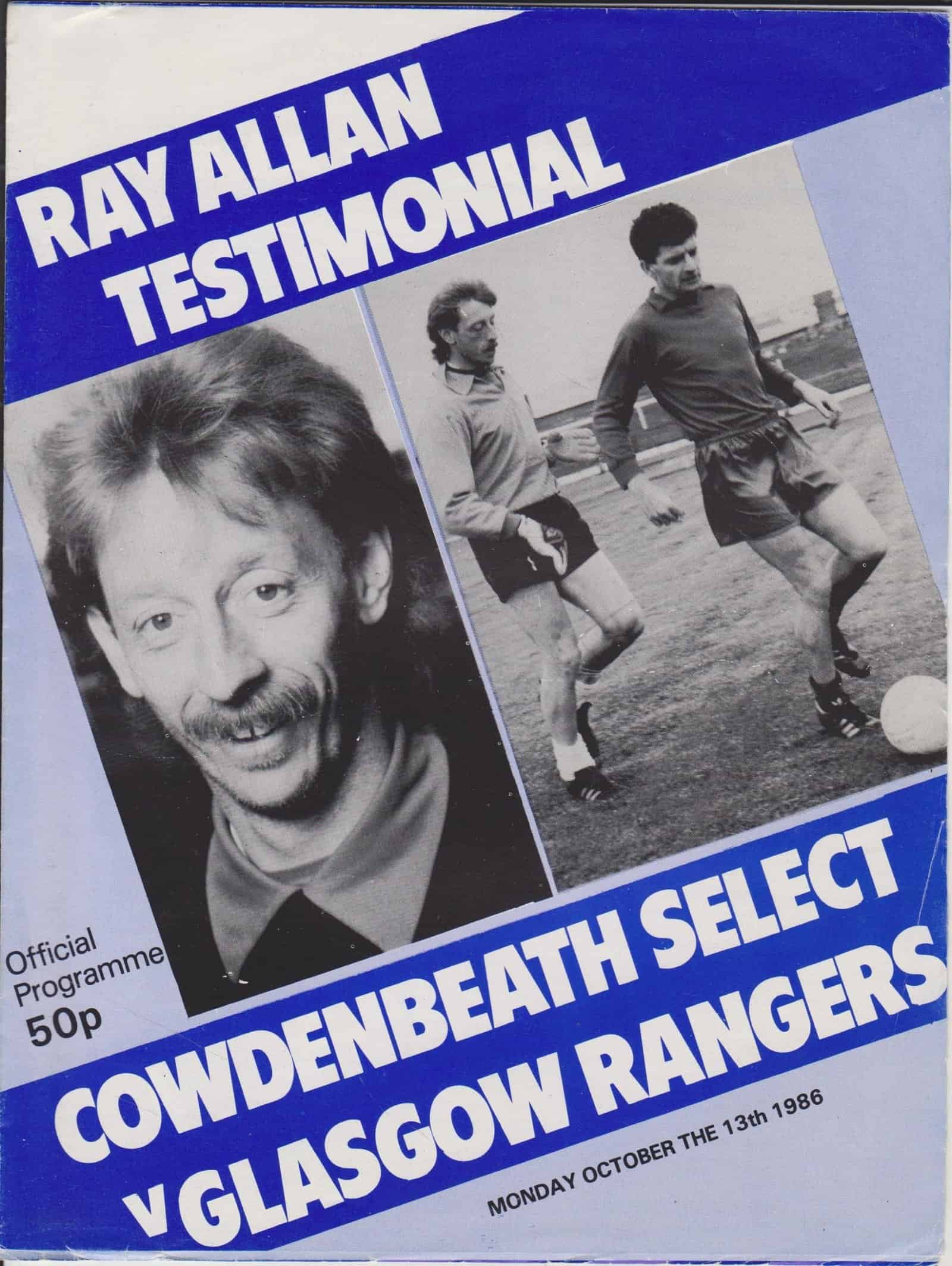 Match: Cowdenbeath v Glasgow Rangers Competition: Friendly Date: 13-Oct-1986 Comments: Ray Alan Testimonial Match Rating: 3 Condition: Faint fold Weight in grams: 40