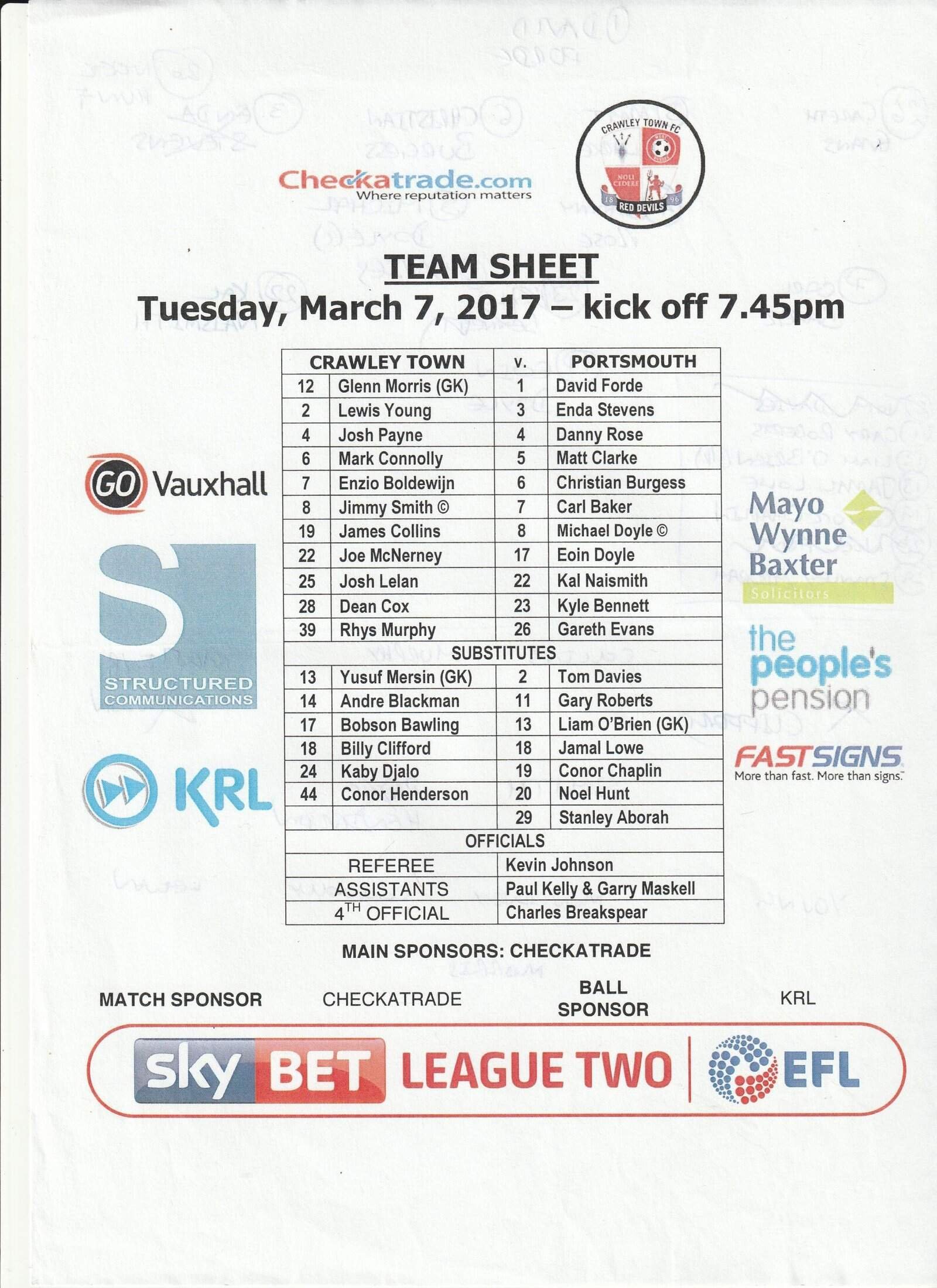Match: Crawley Town v Portsmouth Competition: League 2 Date: 07-Mar-2017 Comments: Rating: 3 Condition: Fold Weight in grams: 20