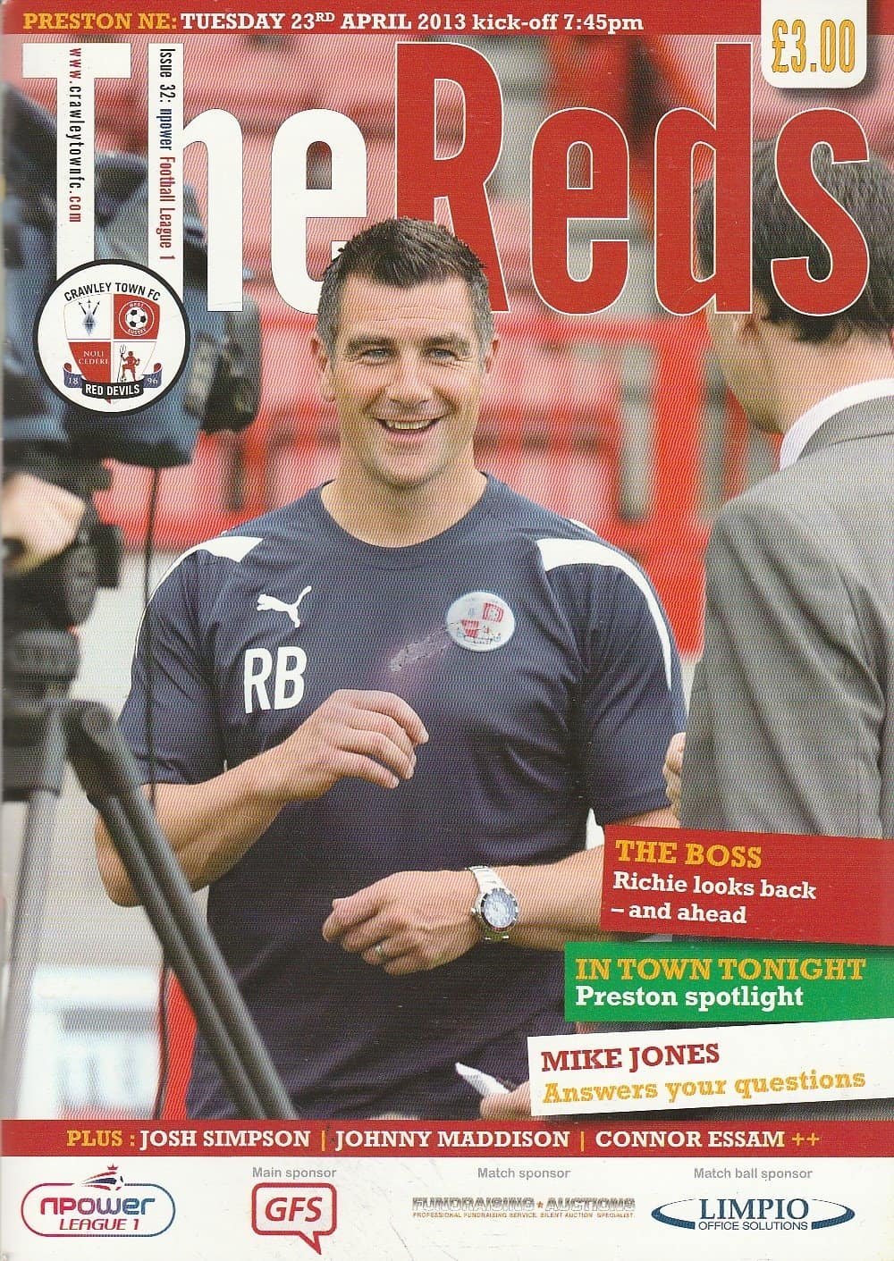 Match: Crawley Town v Preston North End Competition: Sky Bet League 1 Date: 23-Apr-2013 Comments: Rating: 3 Condition: Small tear on top corner of spine, nick on edge of cover Weight in grams: 260