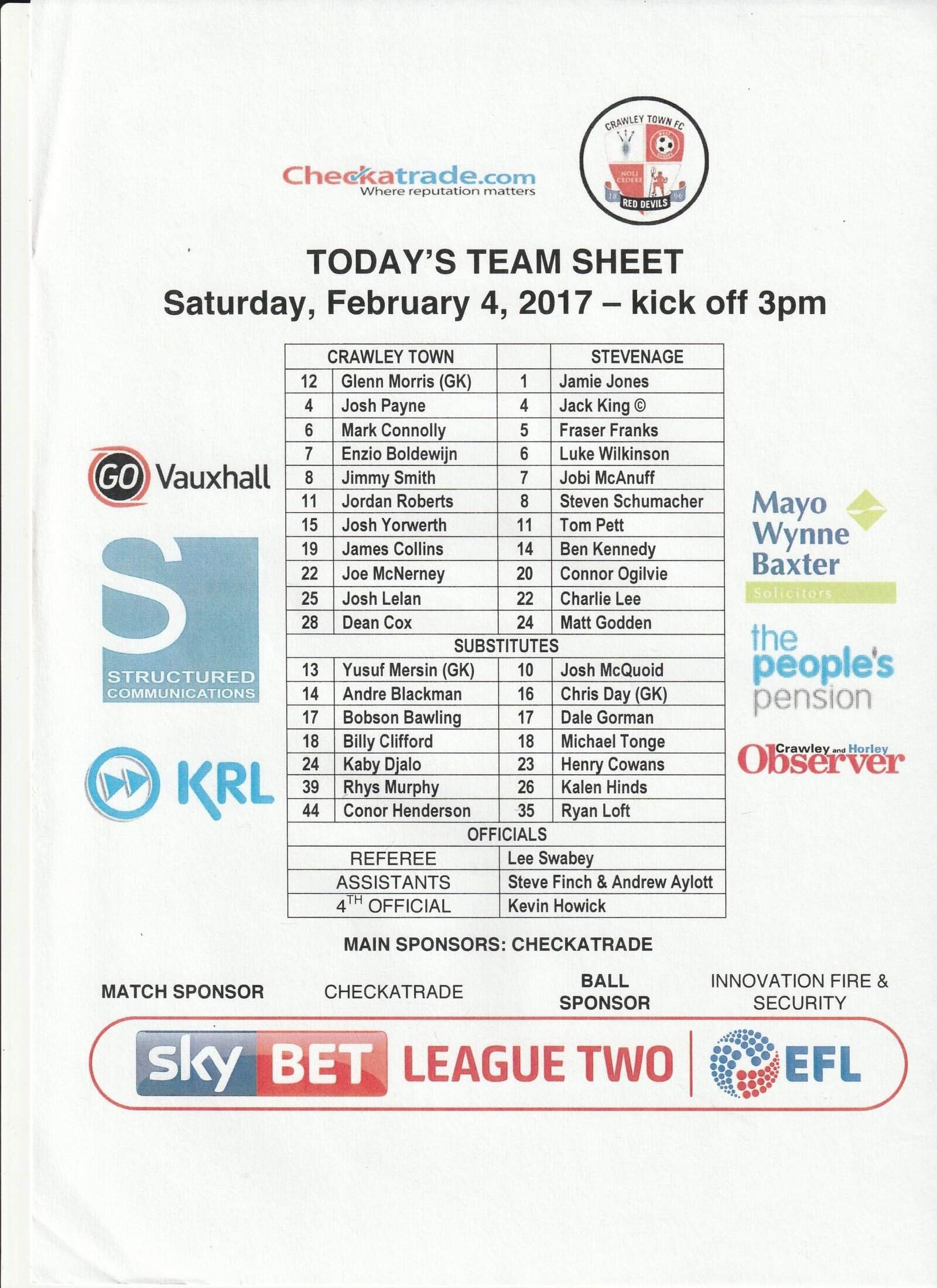 Match: Crawley Town v Stevenage Competition: Sky Bet League 2 Date: 04-Feb-2017 Comments: Rating: 4 Condition: Very good Weight in grams: 20