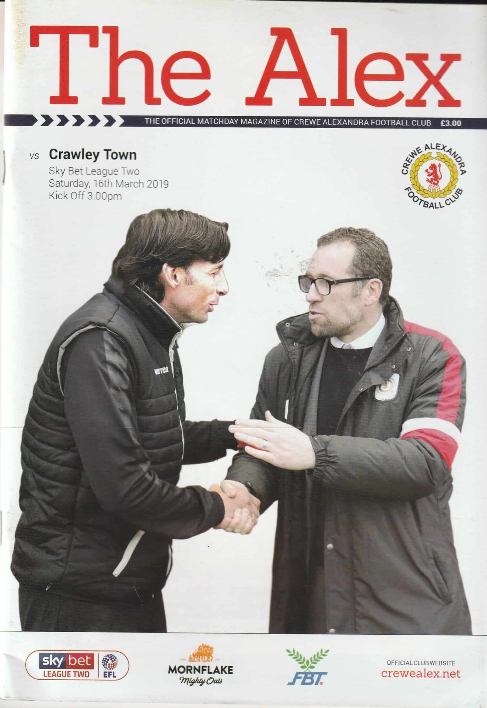 Match: Crewe Alexandra v Crawley Town Competition: League 2 Date: 16-Mar-2019 Comments: Rating: 4 Condition: Slight corner turn Weight in grams: 200