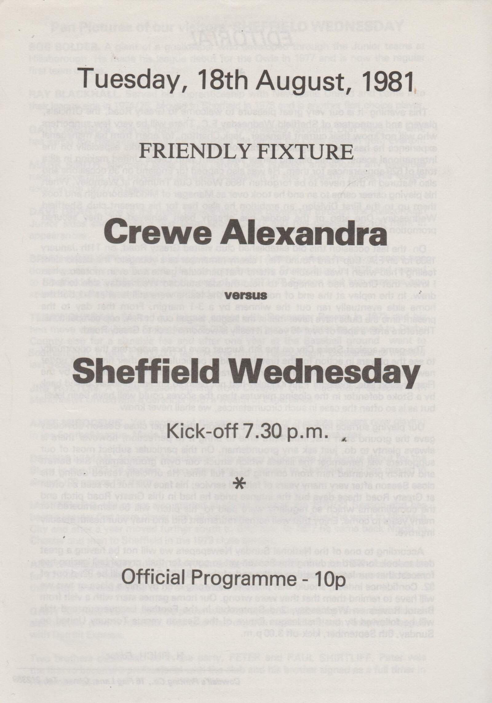 Match: Crewe Alexandra v Sheffield Wednesday Competition: Friendly Date: 18-Aug-1981 Comments: 4 page issue Rating: 4 Condition: Very good Weight in grams: 20