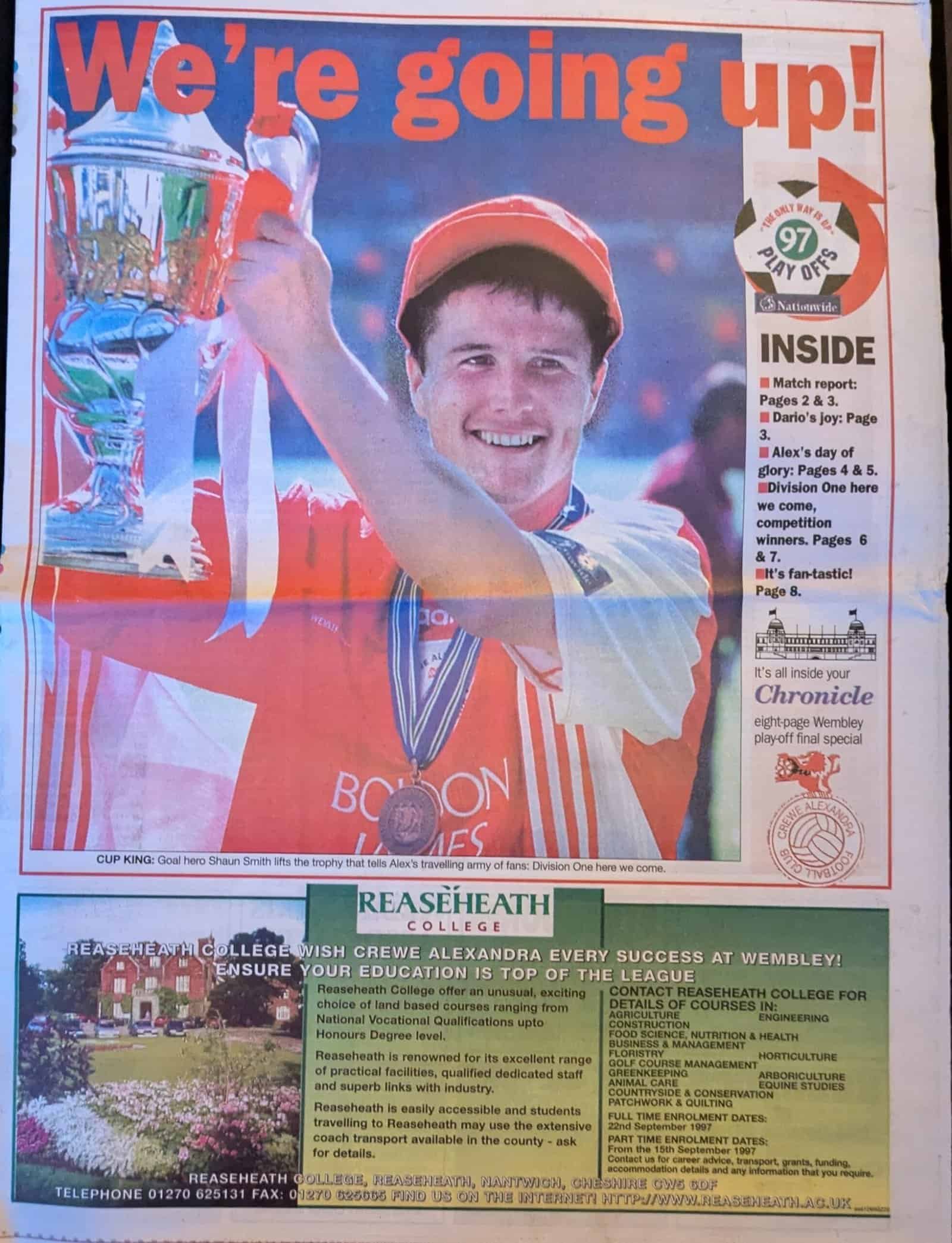 Publication: Crewe Alexandra – We’re going up! Season: 28-May-1997 Comments: Line up details for play off final Alex v Brentford Rating: 4 Condition: Tabloid issue folded Weight in grams: 200