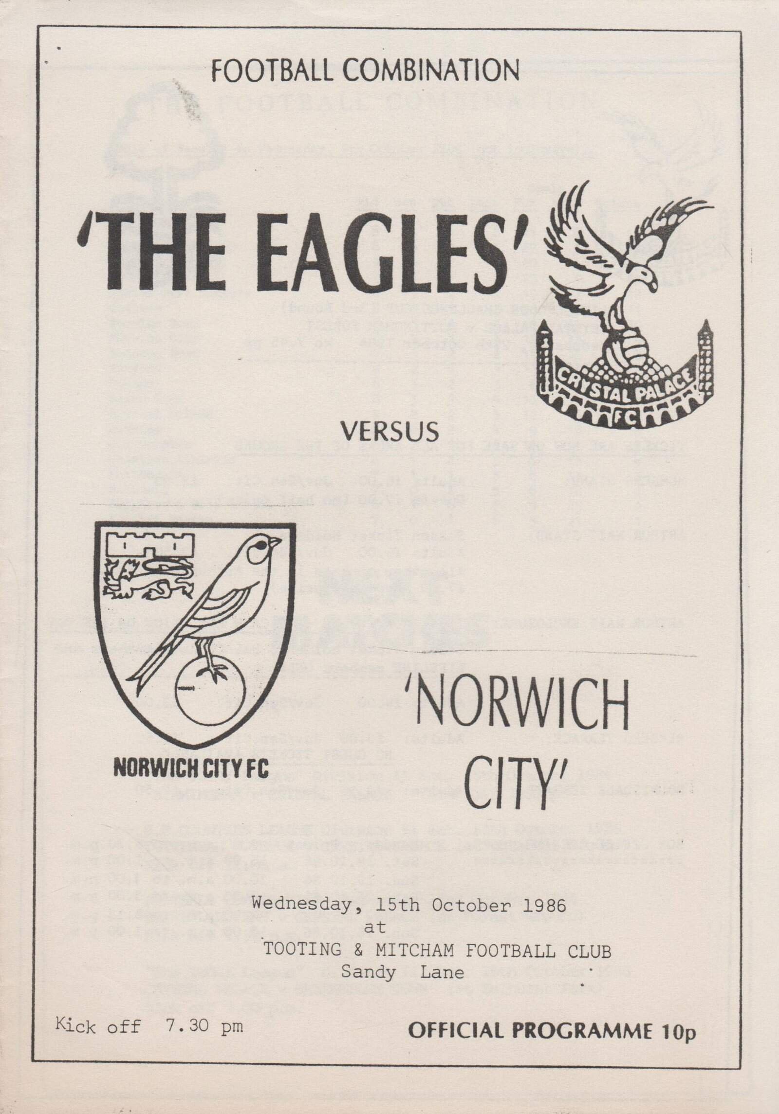 Match: Crystal Palace Reserves v Norwich City Reserves Competition: Football Combination Date: 15-10-1986 Comments: 4 page issue Rating: 4 Condition: Very good Weight in grams: 20