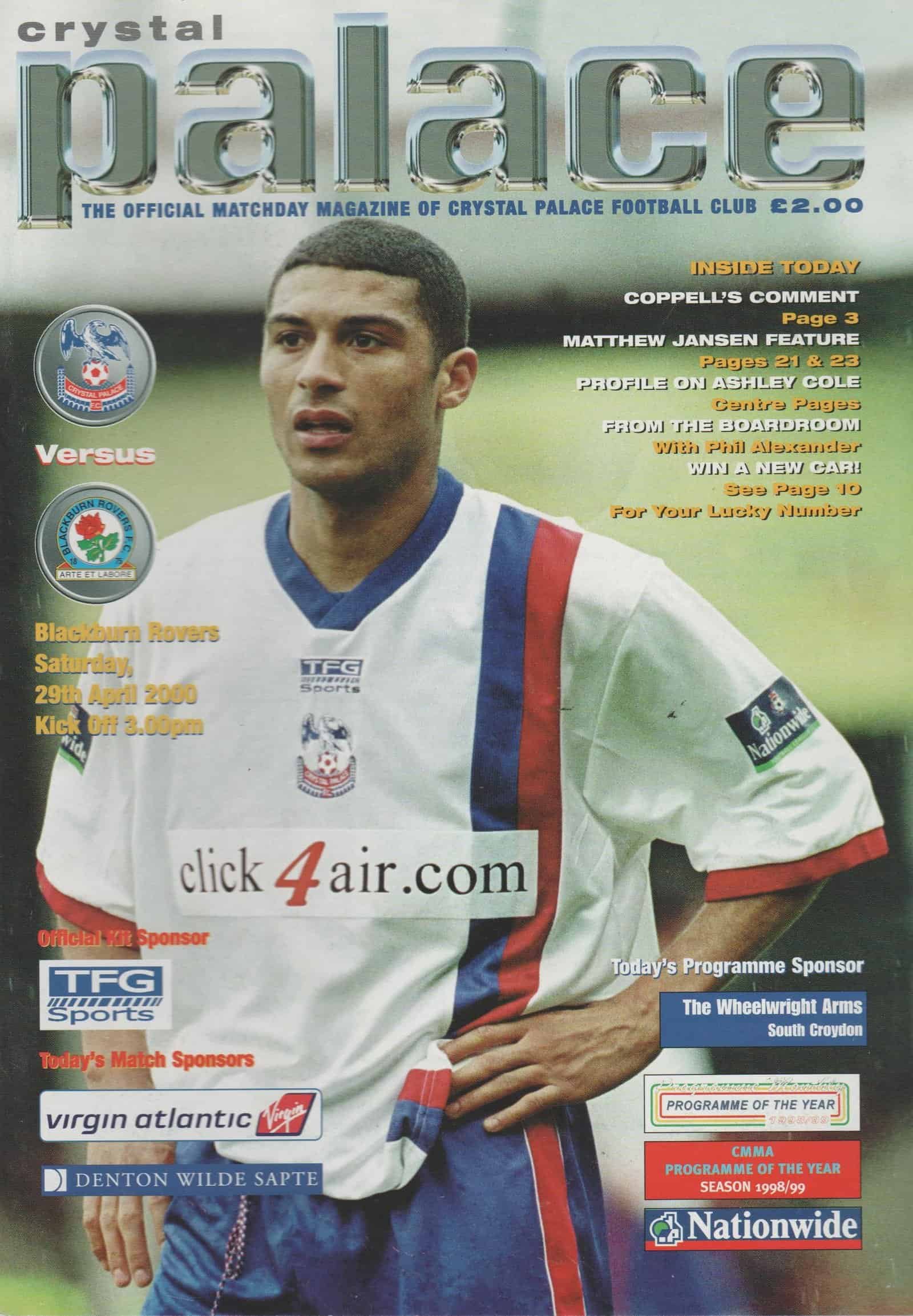 Match: Crystal Palace v Blackburn Rovers Competition: League Division 1 Date: 29-04-2000 Comments: Rating: 4 Condition: Very good Weight in grams: 160