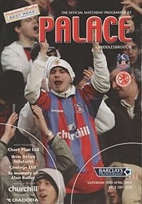 Match: Crystal Palace v Middlesbrough Competition: Premier League Date: 02-04-2005 Comments: Rating: 3 Condition: Print smudge on cover, slight fold Weight in grams: 240
