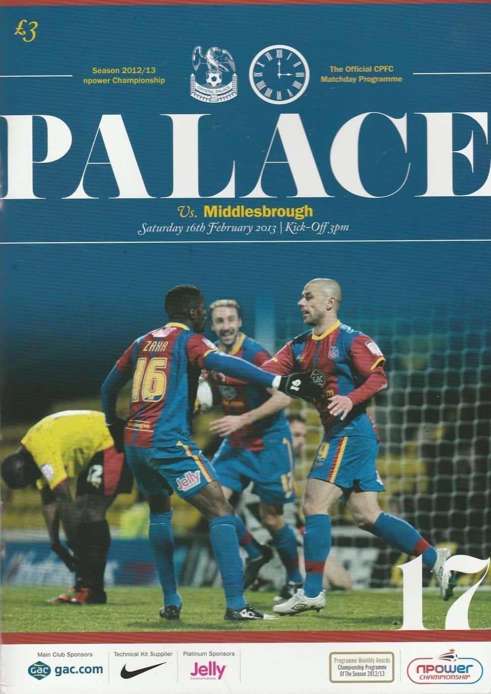 Match: Crystal Palace v Middlesbrough Competition: League Championship Date: 16-Feb-2013 Comments: Includes press cutting Rating: 5 Condition: Excellent Weight in grams: 240