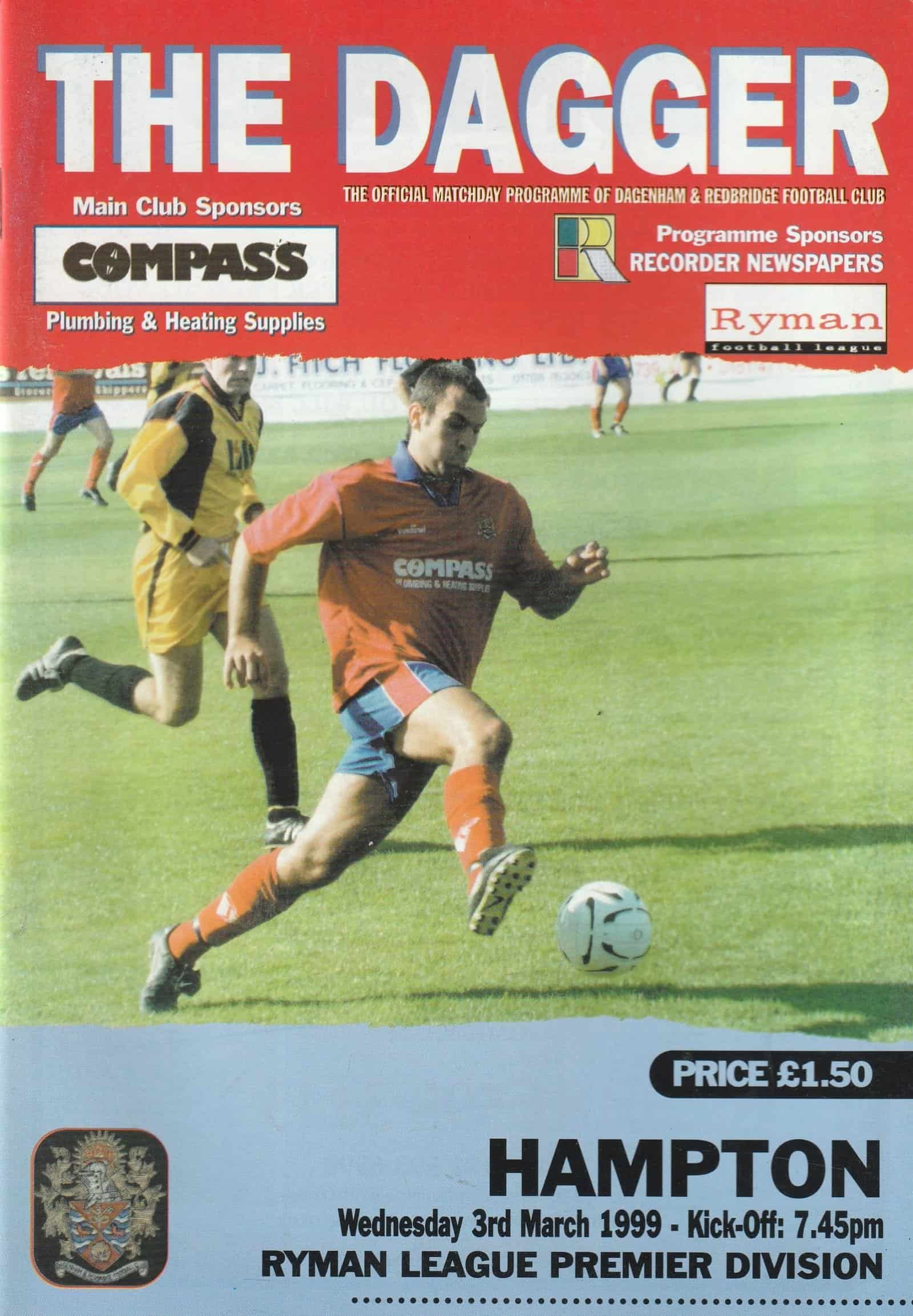 Match: Dagenham & Redbridge v Hampton Competition: Ryman League Premier Division Date: 03-Mar-1999 Comments: Rating: 4 Condition: Very good Weight in grams: 140