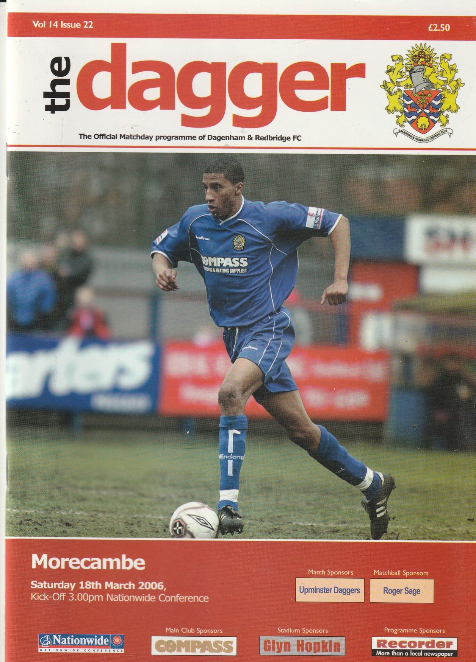 Match: Dagenham & Redbridge v Morecambe Competition: Vauxhall Conference Date: 18-Mar-2006 Comments: Rating: 4 Condition: Very good Weight in grams: 200