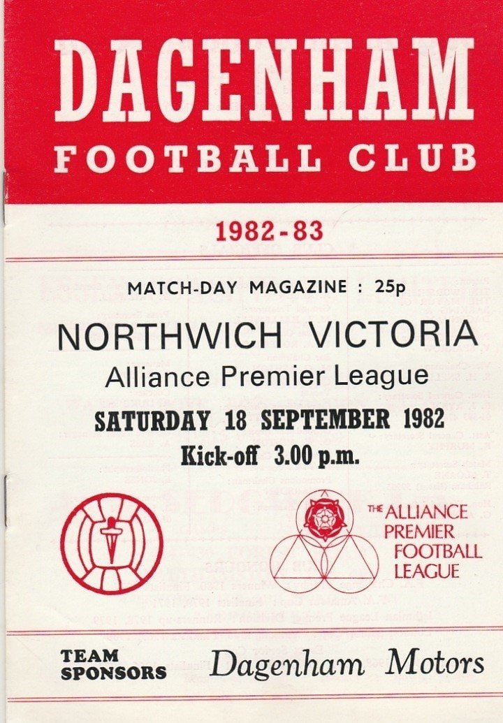 Match: Dagenham v Northwich Victoria Competition: Alliance Premier League Date: 18-Sep-1982 Comments: Rating: 4 Condition: Very good Weight in grams: 60