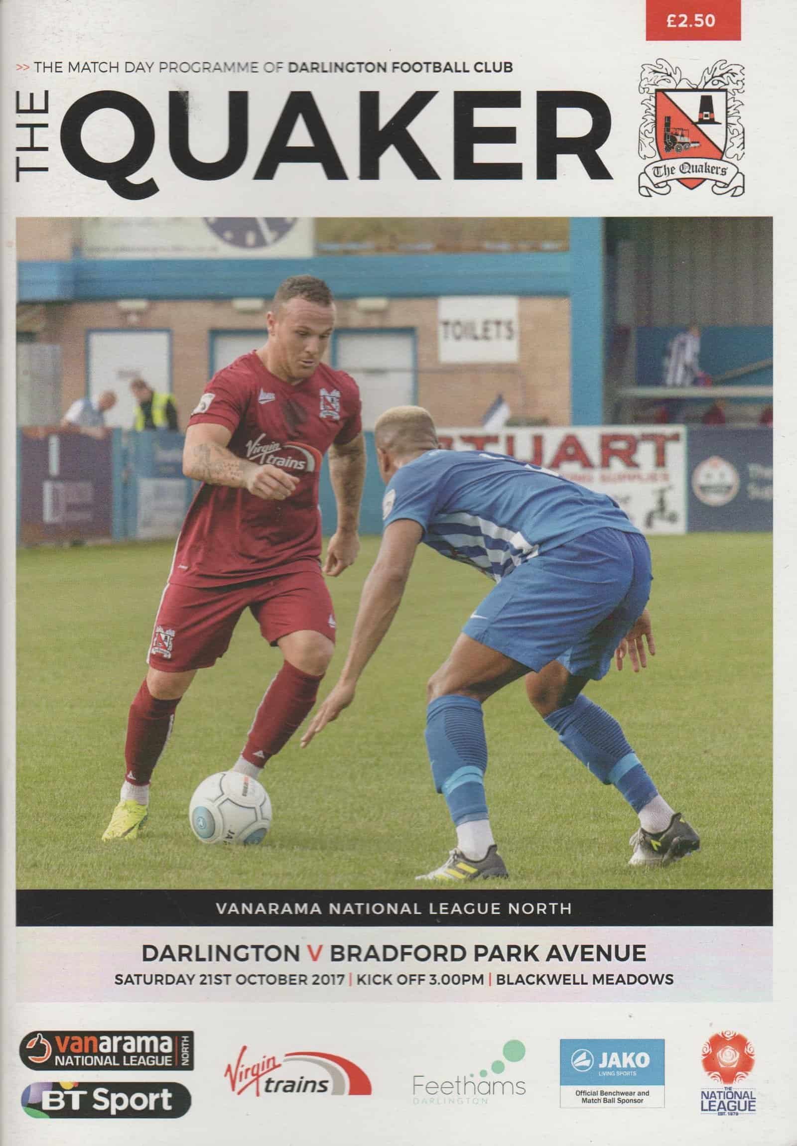 Match: Darlington v Bradford Park Avenue Competition: Vanrama National League North Date: 21-Oct-2017 Comments: Rating: 4 Condition: Very good Weight in grams: 260